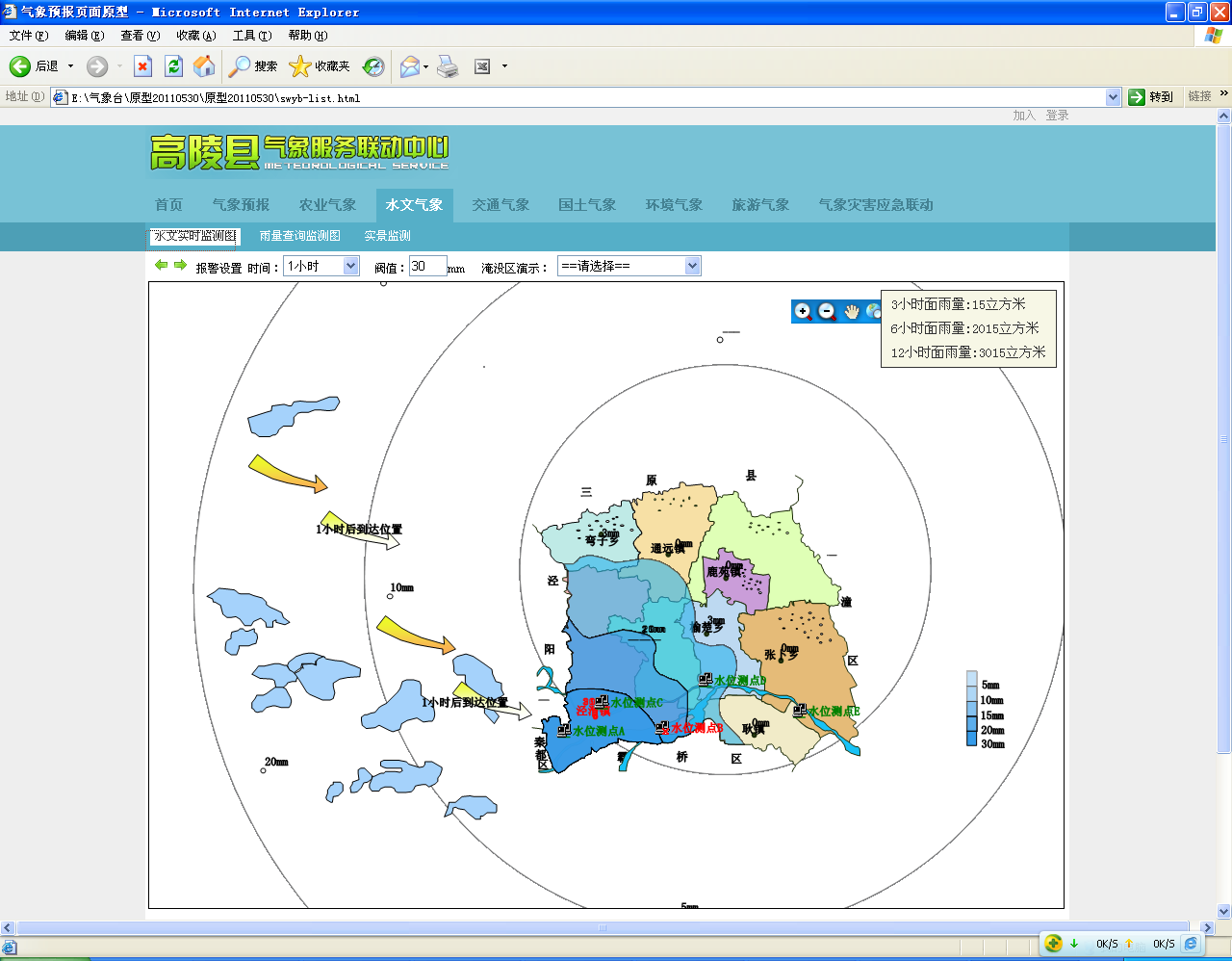 (2)实时雨水情监测:采集水文、气象部门在高陵境内及其泾河、渭河上游相关地区设置的雨量站、水文站/水位站、水库水情站的实时水雨情信息,信息类型包括降水量、河道水情(水位/流量)、水库水情(水位/出、入库流量)等,信息采集方式包括自动采集和人工监测拍报。